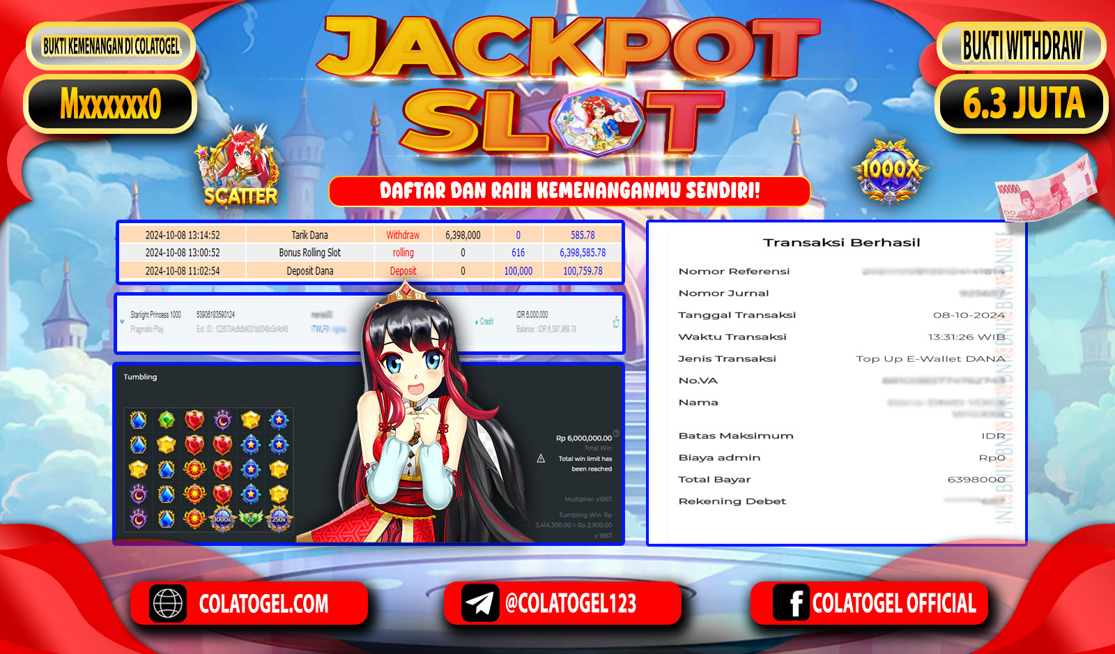 Kami ucapakan Selamat kepada user id : BUKTI PEMBAYARAN SLOT COLATOGEL M*******0 Telah berhasil mendapatkan jackpot pada permainan STARLIGHT PRINCES 1000 dengan kemenangan sebesar Rp6.300.000.- Kemenangan langsung di bayar lunas oleh COLATOGEL hanya dalam waktu 3 - 5 Menit langsung di transfer ke rekening yang terdaftar. Bukti pembayaran ini adalah bukti yang Valid dan dapat di Pertanggung Jawabkan.